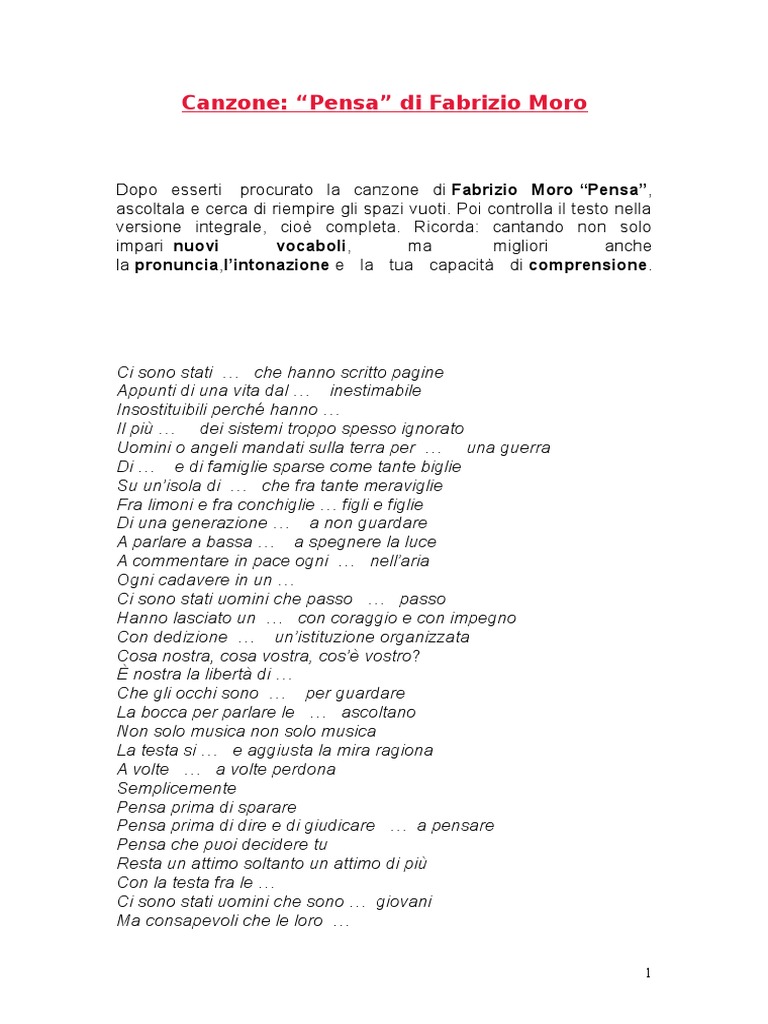 Cantando non solo impari nuovi vocaboli, ma migliori anche la pronuncia, l'intonazione e la tua capacità di comprensione. • 70 млн просмотров 3 года назад. La nuova versione de #ilsensodiognicosa fuori ora ⤵ believe.ffm.to/ilsensodiognicosa. Accordi testi moro fabrizio pensa. Lam mim fa7mag do sol lam.